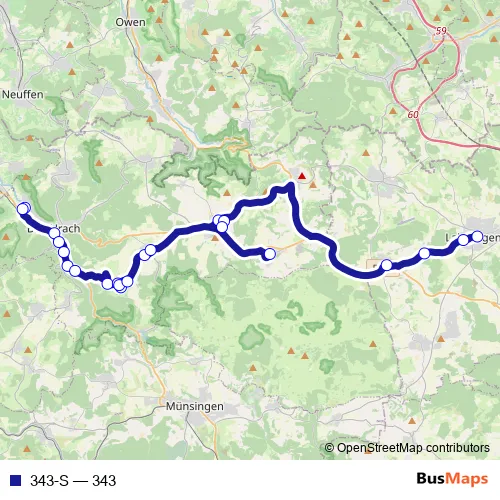 The first stop of the 343-S bus route is Bad Urach, Gymnasium and the last stop is Laichingen Zob. 343-S (343) is operational during an Werktagen.