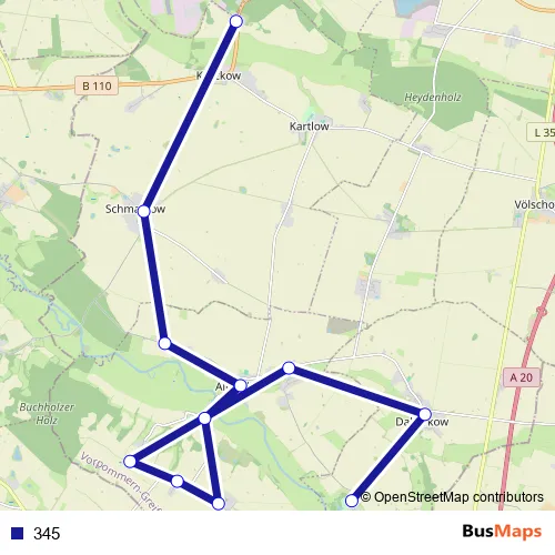 The first stop of the 345 bus route is Tutow Dorf and the last stop is Wietzow. 345 is operational during an Werktagen.