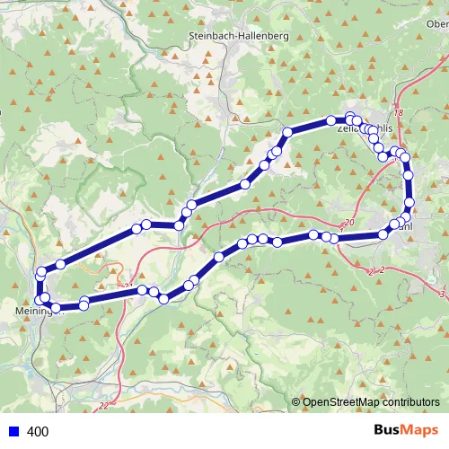 The first stop of the 400 bus route is Meiningen, Busbahnhof and the last stop is Meiningen, Busbahnhof. 400 is operational during täglich.