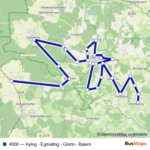 The first stop of the 4000 bus route is Antholing and the last stop is Aying. 4000 (Aying - Egmating - Glonn - Baiern) is operational during an Werktagen.