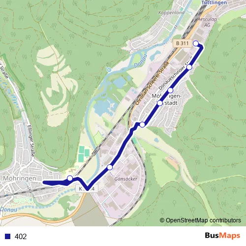 The first stop of the 402 bus route is Möhringen Schule and the last stop is Möhringen-Vorstadt Aesculap. 402 is operational during an Werktagen.