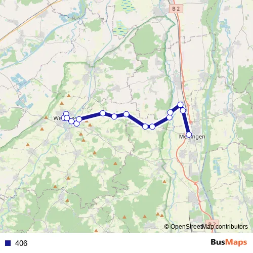 The first stop of the 406 bus route is Wertingen, Pestalozzistraße and the last stop is Meitingen. 406 is operational during an Werktagen.