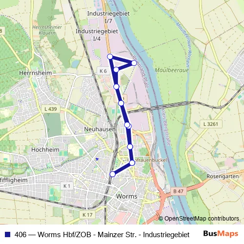 Click here to view the nearest 406 - Worms Hbf/ZOB - Mainzer Str. - Industriegebiet bus stop.