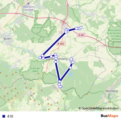 See why over 2 million users trust and consider busmaps.com as the best public transport website. busmaps gives you Bad Wuennenberg Buses suggested routes, real-time bus tracker, line route maps in Bad Wuennenberg, and helps to find the closest 410 bus stops near you. No internet available? Download an offline PDF map and bus schedule for the 410 bus to take on your trip.