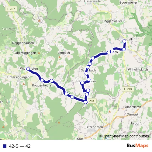 The first stop of the 42-S bus route is Degg.tal, Wittenhofen, Schulhof and the last stop is Horgenzell, Schule. 42-S (42) is operational during an Werktagen.