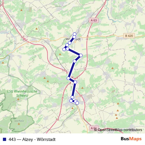 The first stop of the 443 bus route is Wörrstadt, Bahnhof and the last stop is Alzey, Bahnhof Bstg C. 443 (Alzey - Wörrstadt) is operational during täglich.
