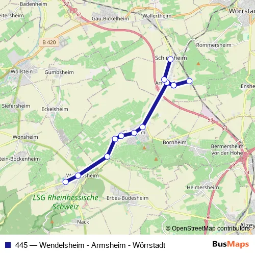 The first stop of the 445 bus route is Wendelsheim, Neugasse and the last stop is Schimsheim, Effenweg. 445 (Wendelsheim - Armsheim - Wörrstadt) is operational during täglich.