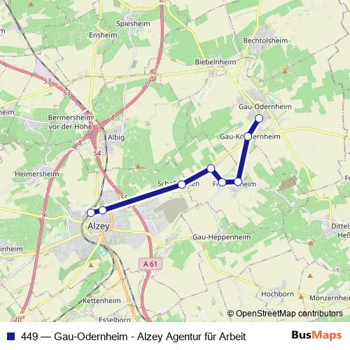See why over 2 million users trust and consider busmaps.com as the best public transport website. busmaps gives you Alzey Buses suggested routes, real-time bus tracker, line route maps in Alzey, and helps to find the closest 449 bus stops near you. No internet available? Download an offline PDF map and bus schedule for the 449 bus to take on your trip.