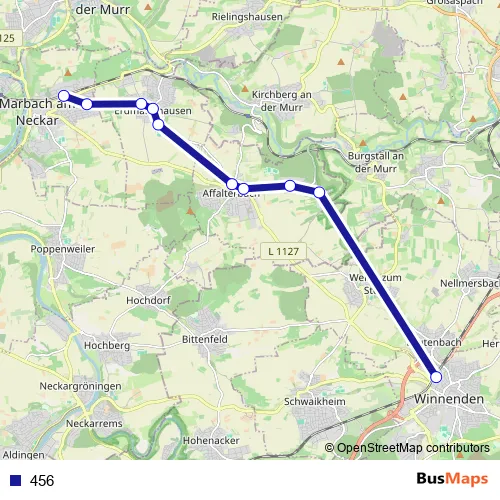 The first stop of the 456 bus route is Affalterbach Wolfsölden and the last stop is Marbach (N). 456 is operational during täglich.