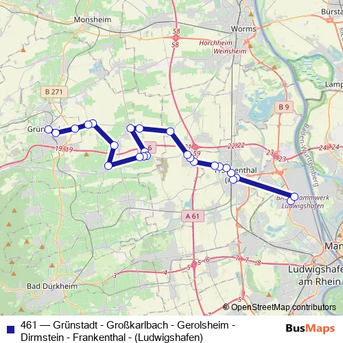The first stop of the 461 bus route is Oppau, Endstelle and the last stop is Grünstadt, Bahnhof. 461 (Grünstadt - Großkarlbach - Gerolsheim - Dirmstein - Frankenthal - (Ludwigshafen)) is operational during täglich.