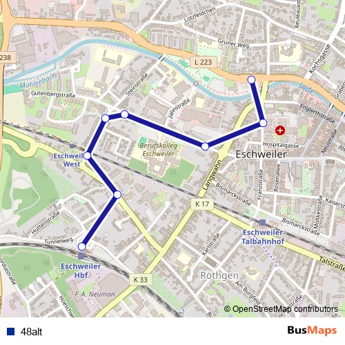 The first stop of the 48alt metro route is Eschweiler, Hauptbahnhof (Bus) and the last stop is Eschweiler, Bushof. 48alt is operational during täglich.