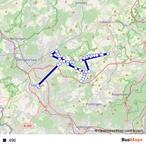 The first stop of the 496 bus route is ZOB Kleiner Markt, Saarlouis and the last stop is Labacher Hof, Reisbach Saarwellingen. 496 is operational during am Wochenende.