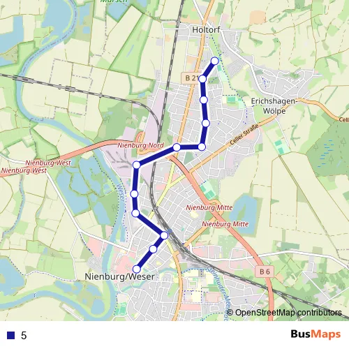 The first stop of the 5 bus route is Holtorf (Nienburg) Sporthalle and the last stop is Nienburg City Treff. 5 is operational during täglich.