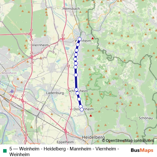 Tram 5 - Weinheim - Heidelberg - Mannheim - Viernheim - Weinheim in Hirschberg an der Bergstrasse: Stops & Timetable