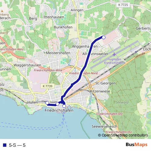 The first stop of the 5-S bus route is Messe West and the last stop is Friedrichshafen, Stadtbahnhof. 5-S (5) is operational during täglich.
