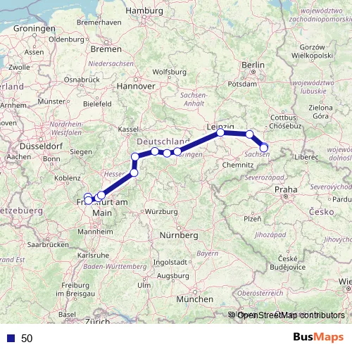 The first stop of the 50 rail route is Wiesbaden Hauptbahnhof and the last stop is Dresden Hauptbahnhof. 50 is operational during täglich.