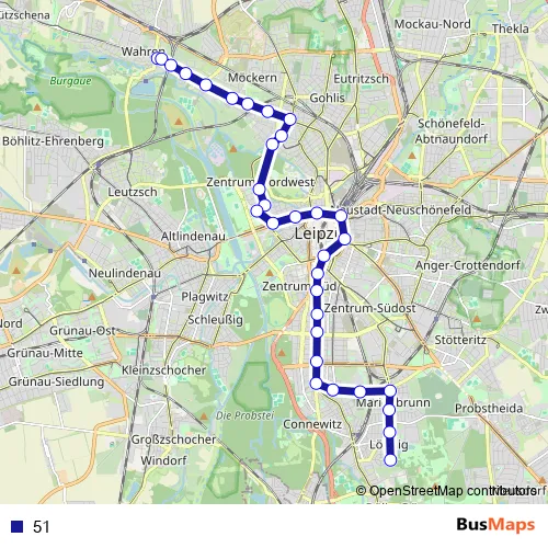 See why over 2 million users trust and consider busmaps.com as the best public transport website. busmaps gives you Leipzig Trams suggested routes, real-time bus tracker, line route maps in Leipzig, and helps to find the closest 51 tram stops near you. No internet available? Download an offline PDF map and bus schedule for the 51 tram to take on your trip.