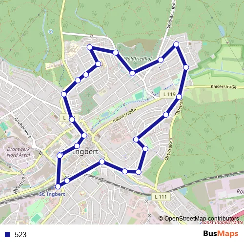 The first stop of the 523 bus route is Rendezvous-Platz, St.Ingbert and the last stop is Rendezvous-Platz, St.Ingbert. 523 is operational during täglich.