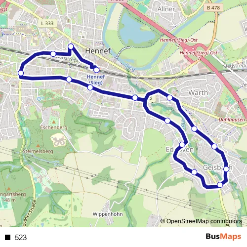 See why over 2 million users trust and consider busmaps.com as the best public transport website. busmaps gives you Hennef (Sieg) Buses suggested routes, real-time bus tracker, line route maps in Hennef (Sieg), and helps to find the closest 523 bus stops near you. No internet available? Download an offline PDF map and bus schedule for the 523 bus to take on your trip.