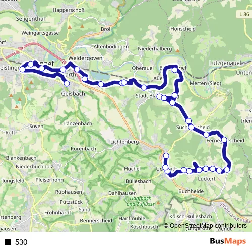 The first stop of the 530 bus route is Hennef Grundschule Hanftal and the last stop is Hennef Uckerath Grundschule. 530 is operational during täglich.