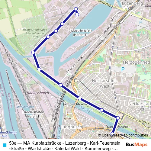 Kurpfalzbrücke. 53e (MA Kurpfalzbrücke - Luzenberg - Karl-Feuerstein-Straße - Waldstraße - Käfertal Wald - Kometenweg - Sonnenschein - Feuerwache Nord - Käfertal Rathaus - MA Käfertal Bf - Im Rott) is operational during täglich.