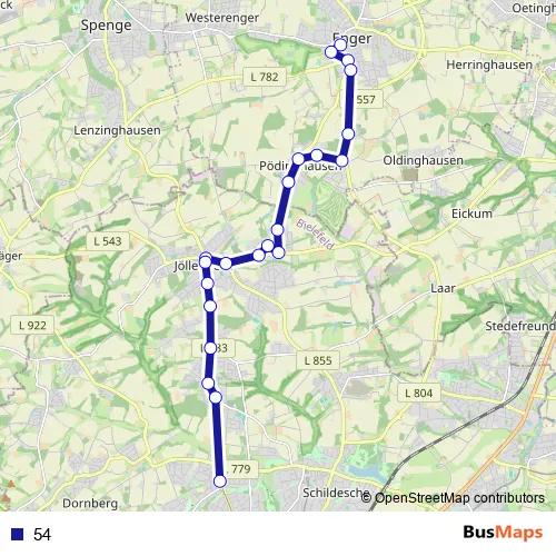 The first stop of the 54 bus route is Enger, Kleinbahnhof and the last stop is Bielefeld, Babenhausen Süd. 54 is operational during täglich.