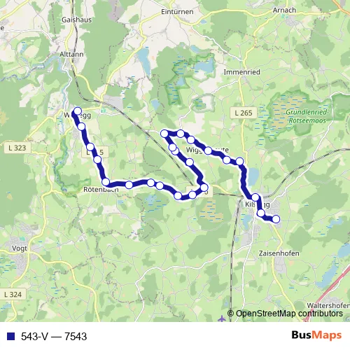 The first stop of the 543-V bus route is Wolfegg, Hofgarten and the last stop is Kißlegg, Schulzentrum. 543-V (7543) is operational during an Werktagen.