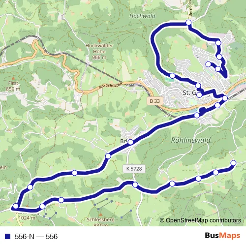See why over 2 million users trust and consider busmaps.com as the best public transport website. busmaps gives you Sankt Georgen im Schwarzwald Buses suggested routes, real-time bus tracker, line route maps in Sankt Georgen im Schwarzwald, and helps to find the closest 556-N bus stops near you. No internet available? Download an offline PDF map and bus schedule for the 556-N bus to take on your trip.
