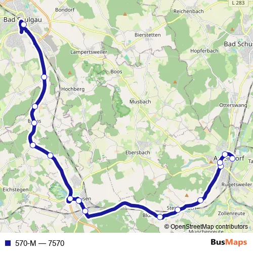 The first stop of the 570-M bus route is Bad Saulgau, Bahnhof and the last stop is Aulendorf, Bahnhof. 570-M (7570) is operational during an Werktagen.