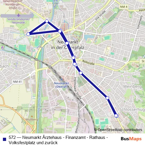 The first stop of the 572 bus route is Neumarkt Ärztehaus and the last stop is Neumarkt Ärztehaus. 572 (Neumarkt Ärztehaus - Finanzamt - Rathaus - Volksfestplatz und zurück) is operational during täglich.