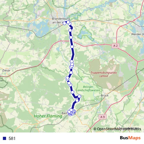 The first stop of the 581 bus route is Bad Belzig, Am Betriebshof and the last stop is