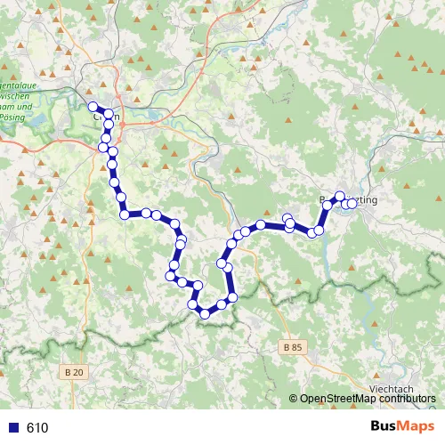 The first stop of the 610 bus route is Cham (Oberpf) and the last stop is Bad Kötzting, Großparkplatz. 610 is operational during an Werktagen.