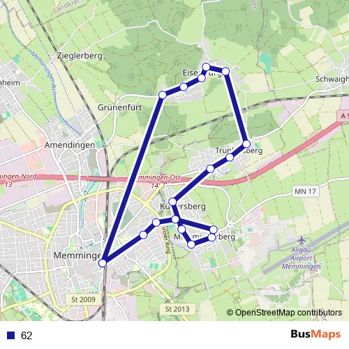 The first stop of the 62 bus route is Memmingen and the last stop is
