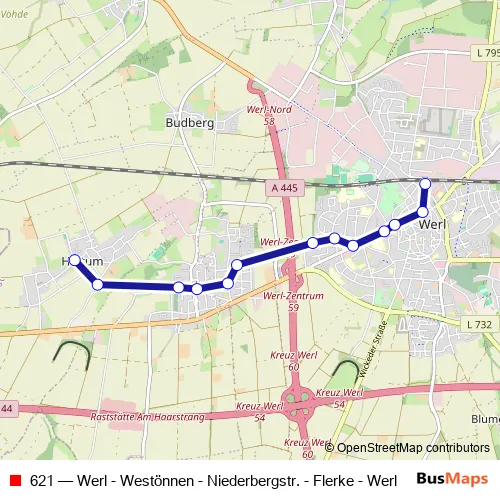 Click here to view the nearest 621 - Werl - Westönnen - Niederbergstr. - Flerke - Werl bus stop.