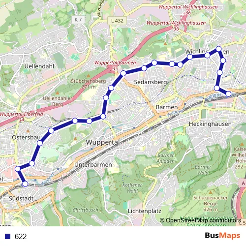 The first stop of the 622 bus route is Wuppertal Oberbarmen Bf and the last stop is Wuppertal Hbf. 622 is operational during täglich.