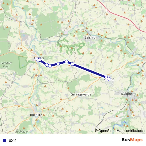 The first stop of the 622 bus route is Colditz, Zentralhaltestelle and the last stop is