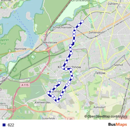 The first stop of the 622 bus route is Stahnsdorf, Waldschänke and the last stop is U Krumme Lanke (Berlin). 622 is operational during täglich.