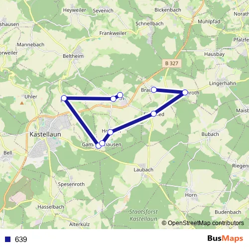 The first stop of the 639 bus route is Gödenroth Waldkindergarten and the last stop is Braunshorn Dorfplatz. 639 is operational during an Werktagen.