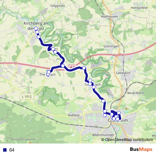 See why over 2 million users trust and consider busmaps.com as the best public transport website. busmaps gives you Kirchberg an der Jagst Buses suggested routes, real-time bus tracker, line route maps in Kirchberg an der Jagst, and helps to find the closest 64 bus stops near you. No internet available? Download an offline PDF map and bus schedule for the 64 bus to take on your trip.