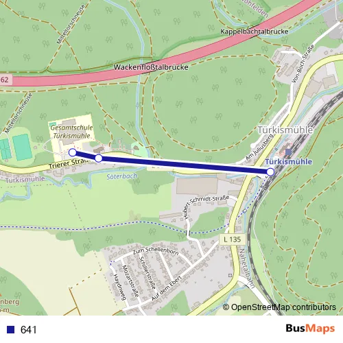 The first stop of the 641 bus route is Schulzentrum, Türkismühle Nohfelden and the last stop is