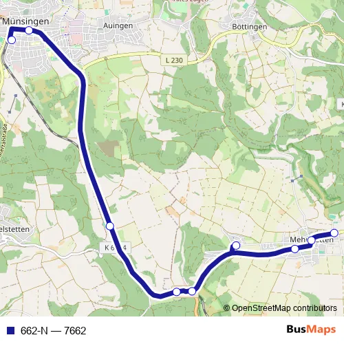The first stop of the 662-N bus route is Mehrstetten, Marktplatz and the last stop is Münsingen Bahnhof. 662-N (7662) is operational during täglich.