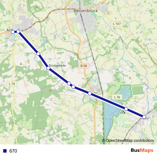 The first stop of the 670 bus route is Ankum Neuer Markt and the last stop is Rieste(Hase) Bahnhof. 670 is operational during an Werktagen.