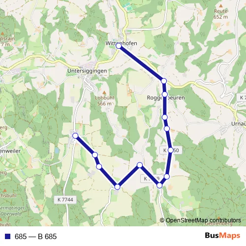 The first stop of the 685 bus route is Grünwangen, Ortsmitte and the last stop is Wittenhofen, Schulhof. 685 (B 685) is operational during am Wochenende.