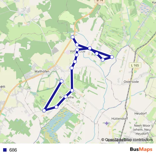 The first stop of the 686 bus route is Wallhöfen, Am Mühlenberg and the last stop is Vollersode, Giehlermühlen. 686 is operational during an Werktagen.