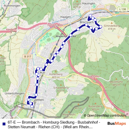 Click here to view the nearest 6T-E - Brombach - Homburg-Siedlung - Busbahnhof - Stetten Neumatt - Riehen (CH) - (Weil am Rhein Tullastraße) bus stop.