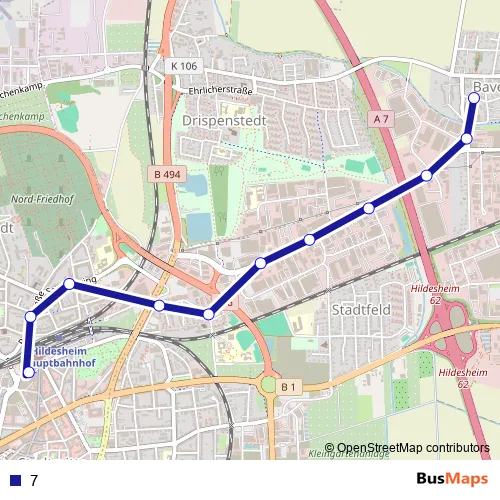 See why over 2 million users trust and consider busmaps.com as the best public transport website. busmaps gives you Hildesheim Buses suggested routes, real-time bus tracker, line route maps in Hildesheim, and helps to find the closest 7 bus stops near you. No internet available? Download an offline PDF map and bus schedule for the 7 bus to take on your trip.