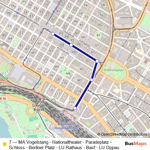 The first stop of the 7 tram route is Paradeplatz and the last stop is MA Hauptbahnhof. 7 (MA Vogelstang - Nationaltheater - Paradeplatz - Schloss - Berliner Platz - LU Rathaus - Basf - LU Oppau) is operational during täglich.