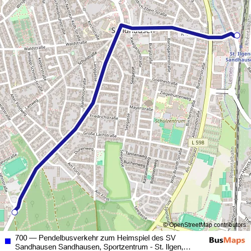 The first stop of the 700 bus route is Sandhausen, Sportzentrum and the last stop is St. Ilgen, Bahnhof West. 700 (Pendelbusverkehr zum Heimspiel des SV Sandhausen Sandhausen, Sportzentrum - St. Ilgen, Bahnhof) is operational during täglich.