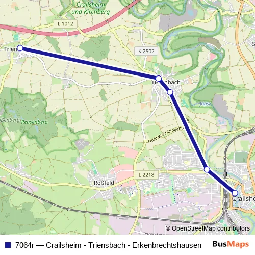 The first stop of the 7064r bus route is Crailsheim Zob and the last stop is Triensbach Gasthaus Rose. 7064r (Crailsheim - Triensbach - Erkenbrechtshausen) is operational during täglich.