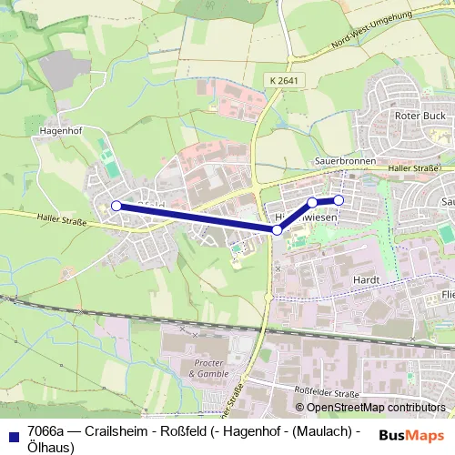 Click here to view the nearest 7066a - Crailsheim - Roßfeld (- Hagenhof - (Maulach) - Ölhaus) bus stop.